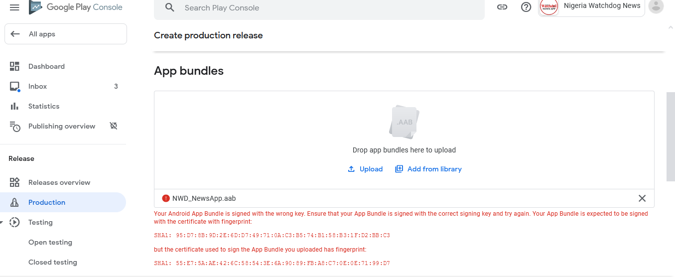 Now I want to publish my news app to google play store, but at the point of uploading my .aab file it showed this error below. I didn’t see a place to upload the apk as it only requested for .aab