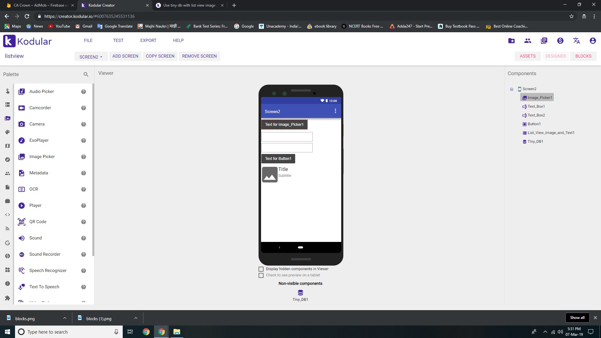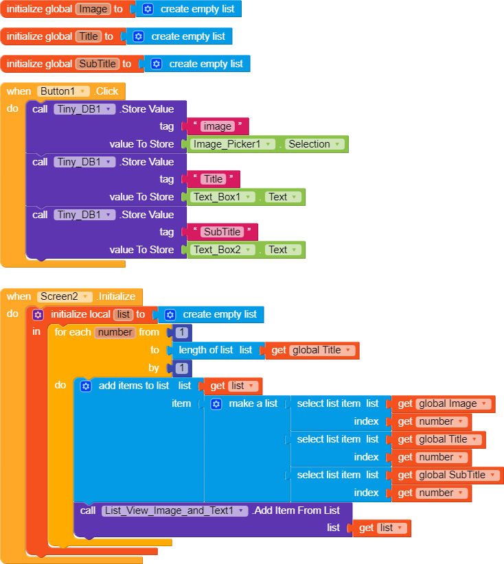 I can’t able to use tiny db with list view image, text component. If you can please share blocks.