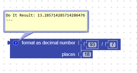 I would like to show he result of division 93/7 with 18 digits without rounding. The results is a periodic number as 13.285714285714285714=13.(285714) but if I put 18 digit in the block, the result is 13.285714285714286476 rounding from14th digit.
