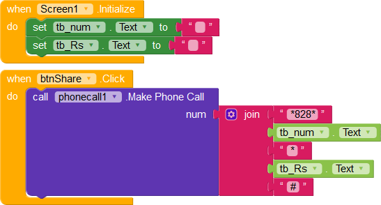 I was working on simple app that simply include a dial code (* 828 * PhoneNo *Money #) for sharing sim credit balance of my carrier. This is a service provided by my carrier Ufone.