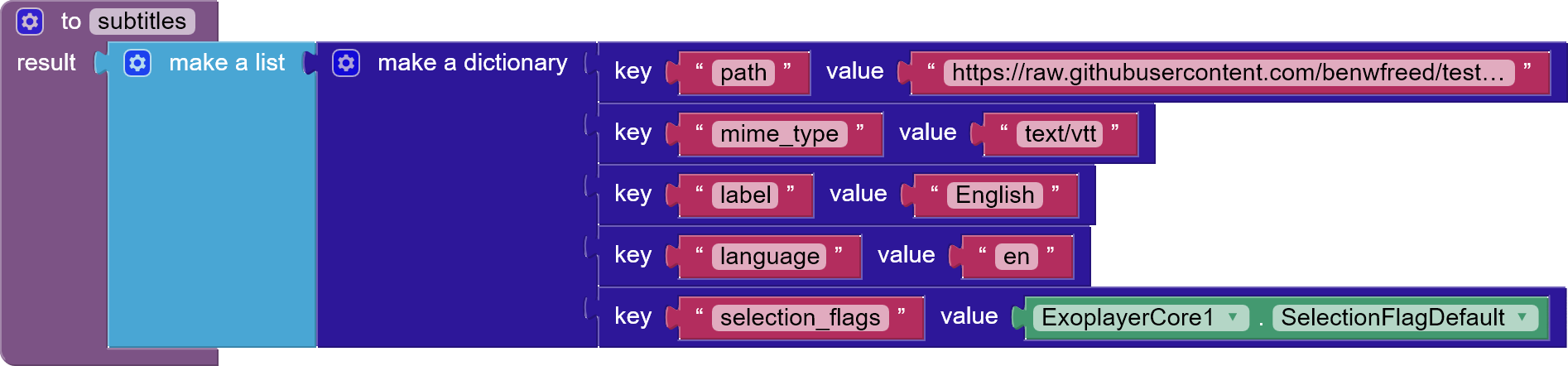 You can pass a list of subtitles by using dictionary blocks.