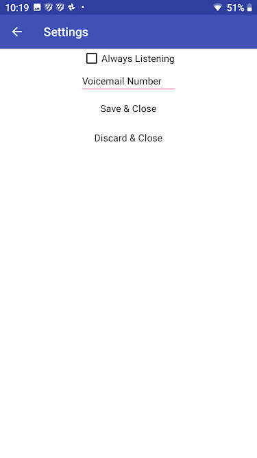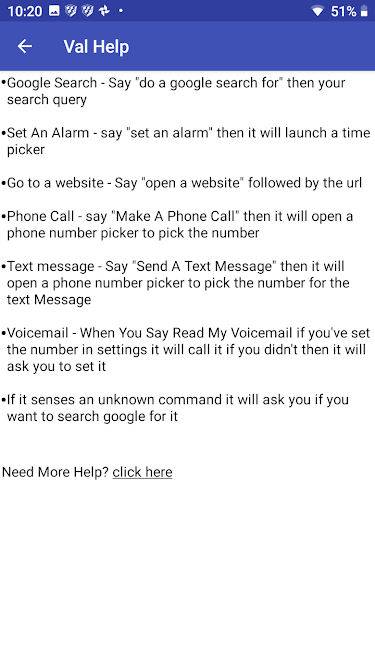 Commands: Google Search - Say “do a google search for” then your search query Set An Alarm - say “set an alarm” then it will launch a time picker Go to a website - Say “open a website” followed by the url Phone Call - say “Make A Phone Call” then it will open a phone number picker to pick the number Text message - Say “Send A Text Message” then it will open a phone number picker to pick the number for the text Message Voicemail - When You Say Read My Voicemail if you’ve set the number in settings it will call it if you didn’t then it will ask you to set it If it senses an unknown command it will ask you if you want to search google for it To Open Settings Or Help Just Say “Settings” Or “Help” Continuous Listening - Say “Hey Val” to activate Val