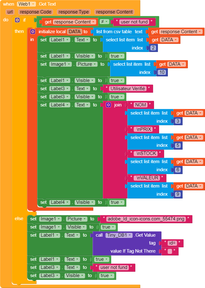 Hello community. I come to you to ask for help. I created a mobile application with kodular. this application should normally allow verification when scanning a QR code. after the scan, the application must display the NAME, the PRICE, the STOCK, the PHOTO of the good and the AMORTIZATION VALUE which is found in the database google sheet. In the QR Code we have the ID. But when I scan I have this error: