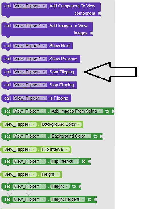 Ok I made it. It works even without the Start Flipping, but I have to swipe the “View Flipper” Component itself to swipe the linked/added components. So I see a) the View Flipper (his background, height set to fill parent) AND b) one of both components linked to the flipper (also height set to fill parent).