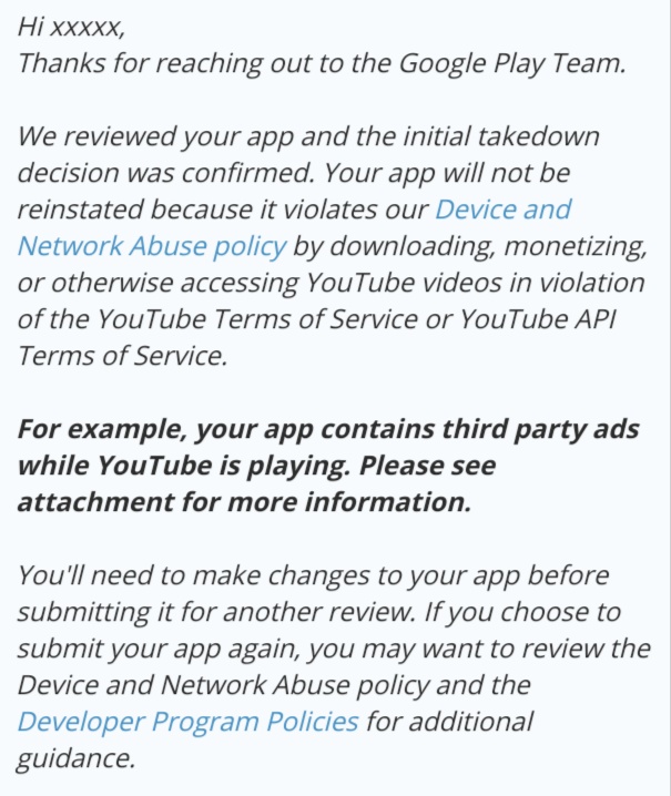 I have seen many apps on Playstore who are 2 & more years old which contains Youtube even you can see browsers containg Youtube in home screen then why this problem does not happens to them.