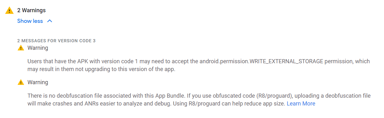 I was upload new version of my app and i got this two errors. I don’t know anything about it so i searched on kodular community but didn’t found any solution. I’ll be very thankful if any one can help with that.