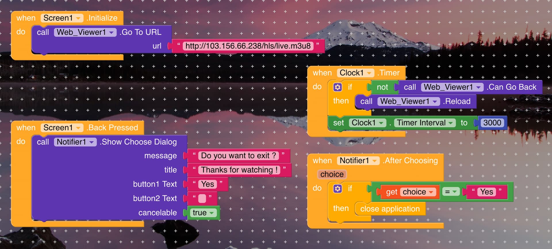 I made my app, it plays m3u8 hls link in webview when app start (working as expected). When the m3u8 link goes down it stop playing (working also as expected). But when the m3u8 link comes back online/alive again it doesnot resume playing in my app (not working as expected). please suggest what can i do or what am i doing wrong. Below my code screenshot.