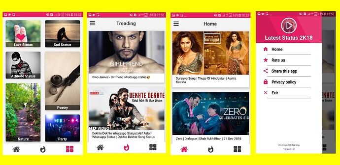 Description: This aia file work in makeroid or kodular and we can create a WhatsApp status app with this aia file. The app has a simple splash screen with slider menu. The app shows the home, trending section and categories section. The home contains the new videos uploaded to the app, the trending section contains the trending videos in the app and the categories section has the number of categories such as love, sad and funny category etc. The slider menu has home, rate us, share the app, privacy policy and exit buttons. When clicking on any video the new screen open in the app that shows video player, video download and share button. The app also shows the related videos below the video player. The app is fully dynamic and created with airtable.