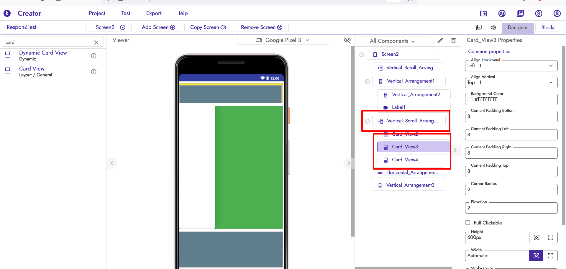 Because you are using the cardview inside the vertical arrangement so vertical arrangement have fill parent width but the cardview have some margin that’s why it doesn’t covered full width of the device.