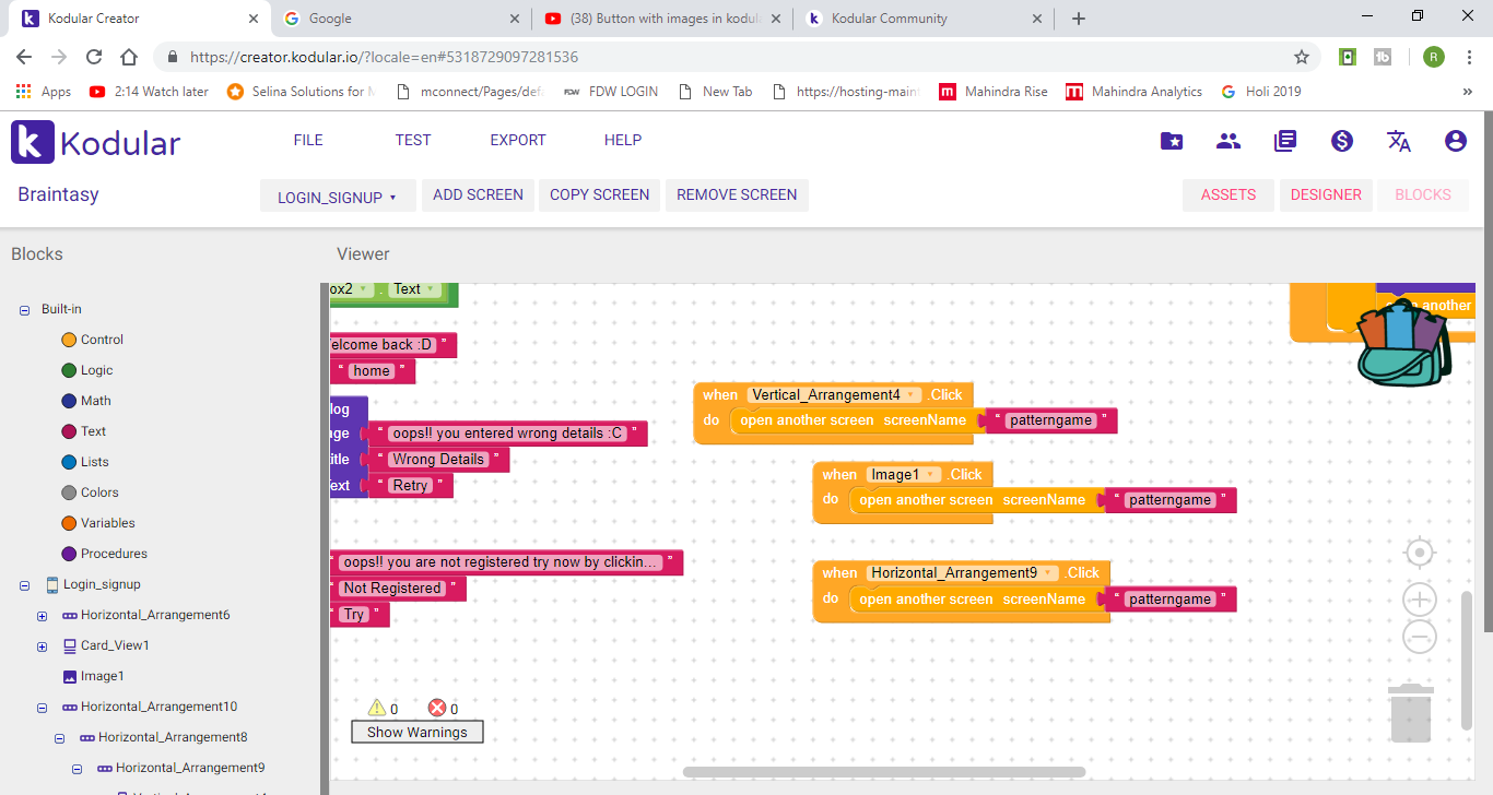 I have created a block that open another screen when button click and arrangement, image click open another screen but not workinng