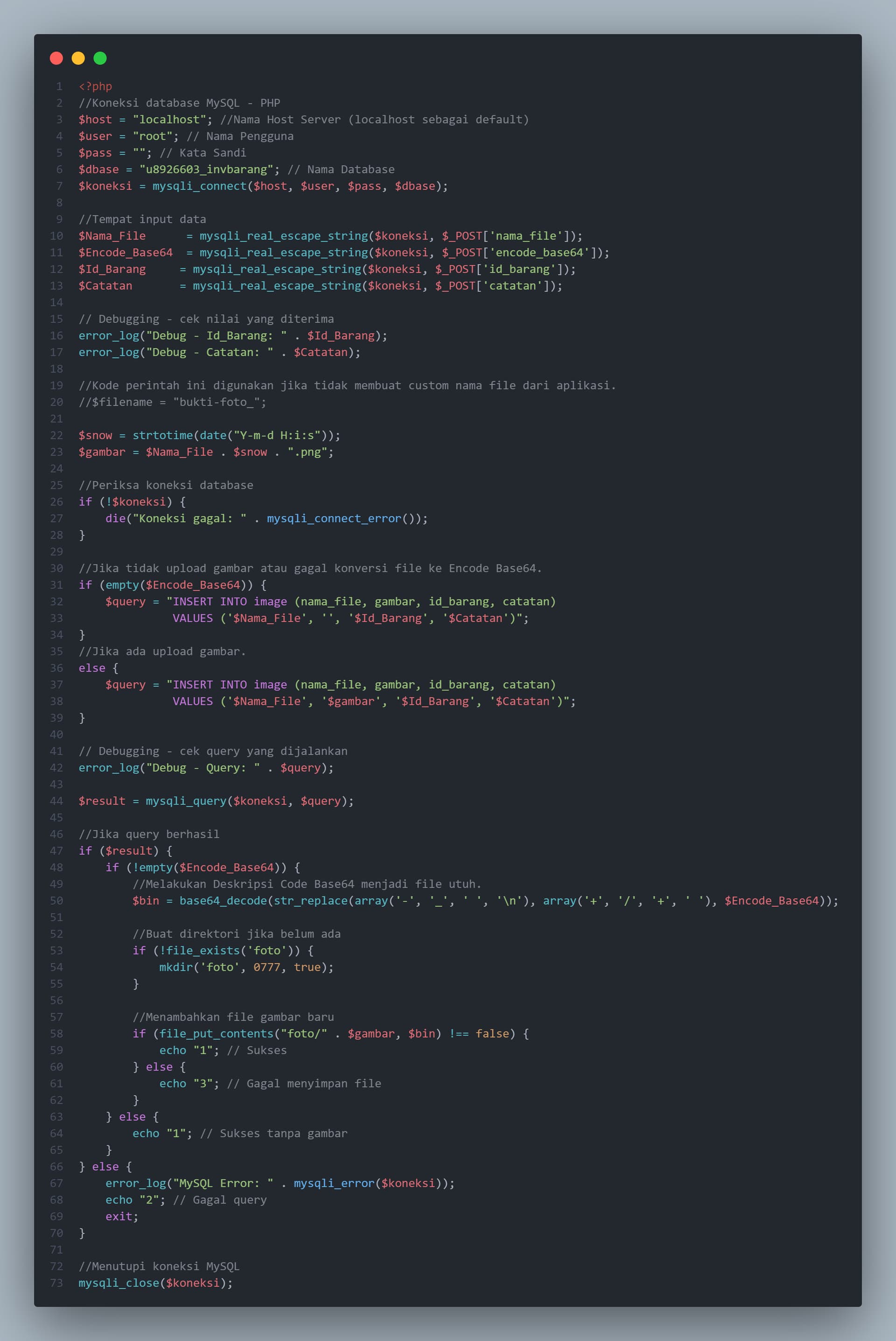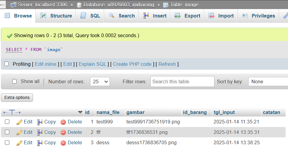 Why is the input id_barang and catatan not entered in the following MySQL database table?