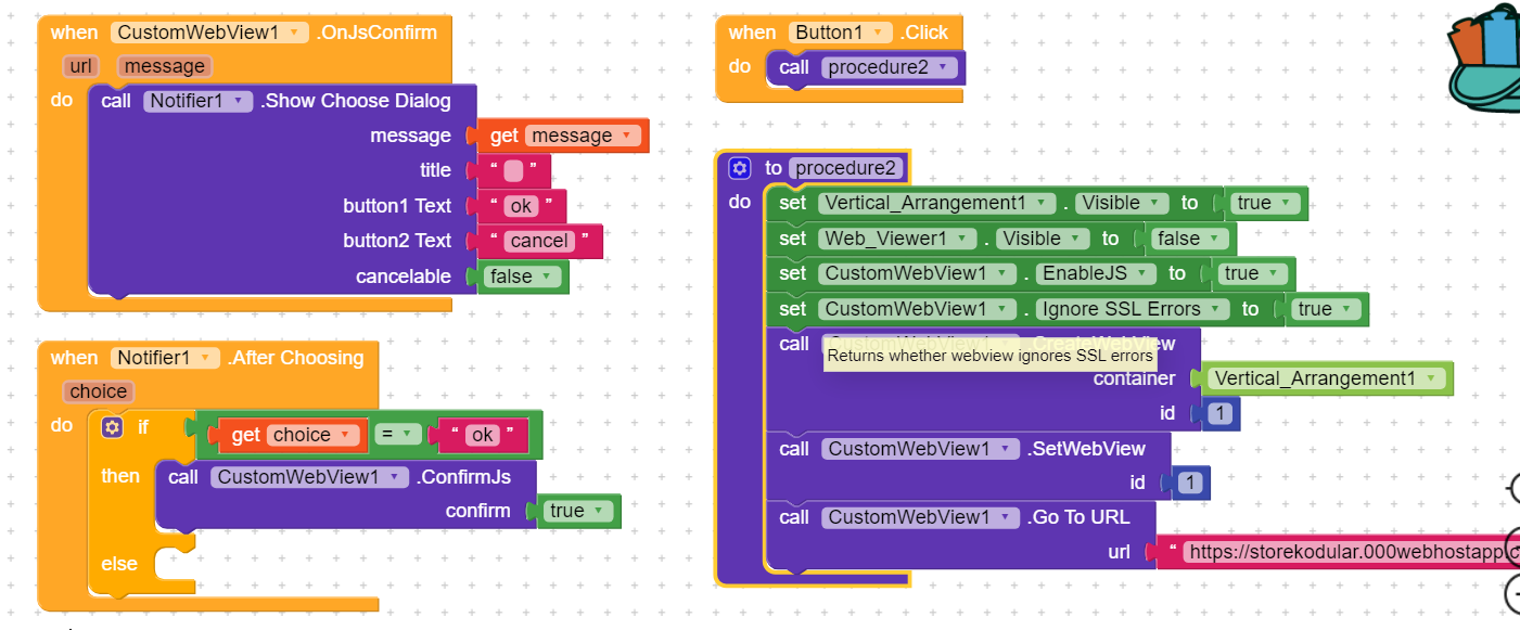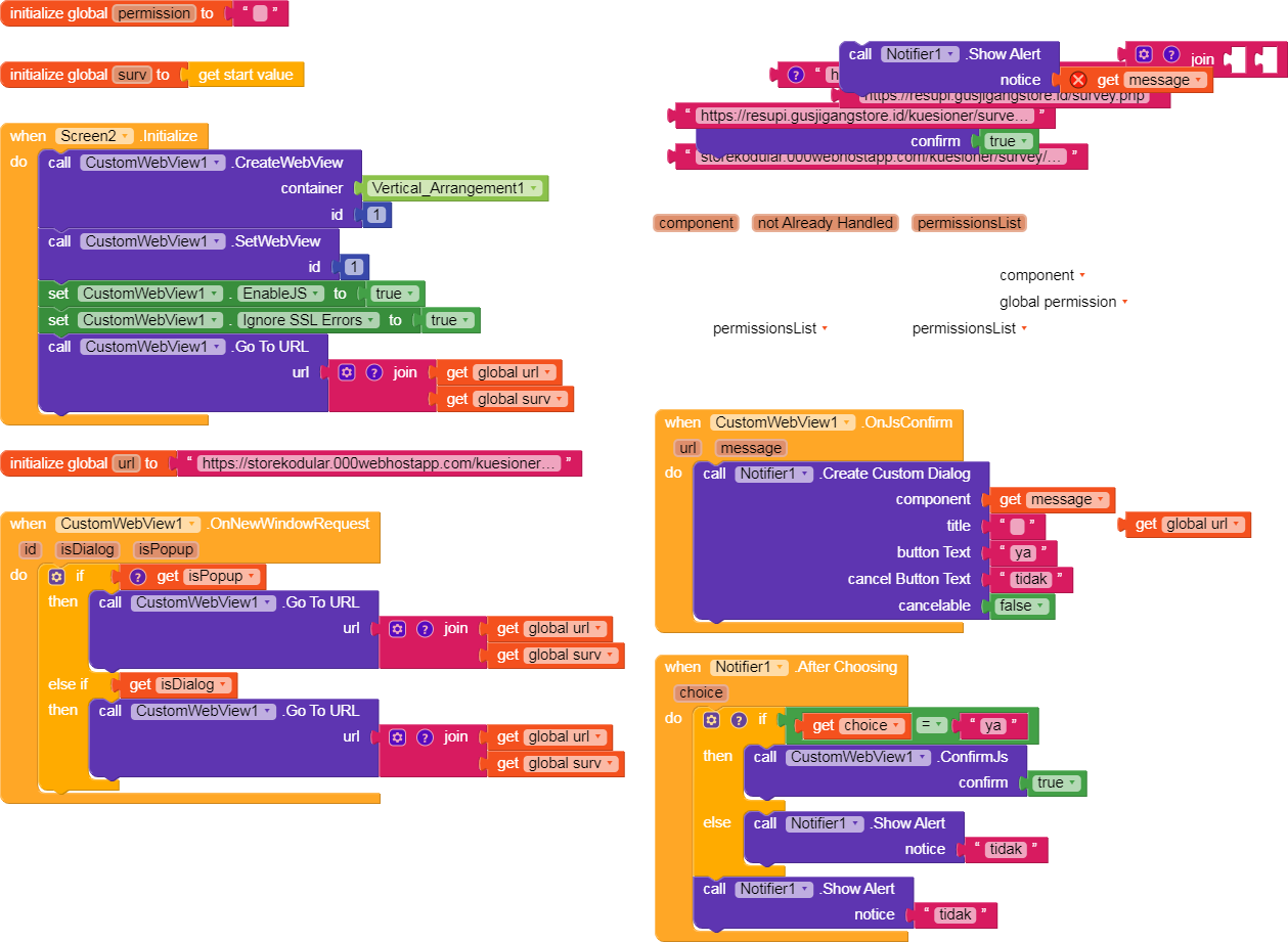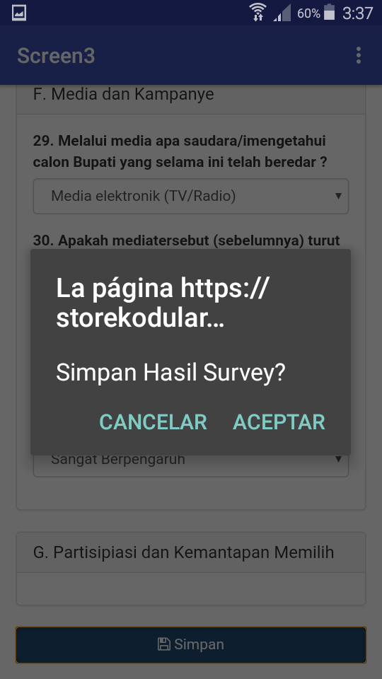 See here, when I push button site is loaded, when Simpan pressed in webviewer a notifier pops up “Simpan Hasil Survey” - Cancel - Ok and when I press ok it says please fill…
