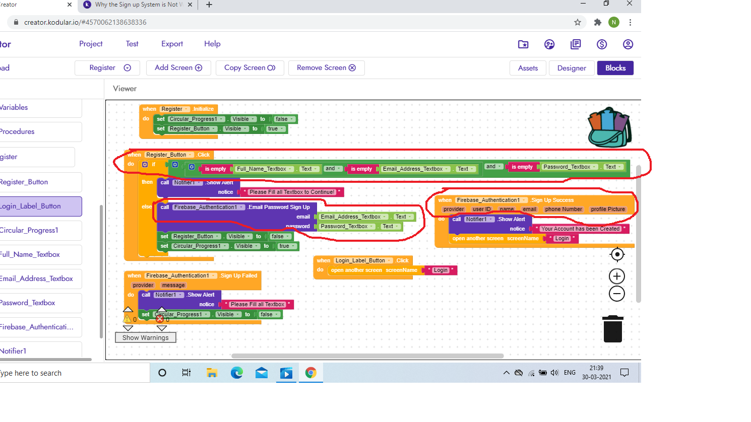 Why the Sign up System is not Working? but the Login System Works Perfectly Fine. I tried to Add an Account using the Firebase Authentication Users in firebase.google.com and I tried to Log in it works the Only Problem is the Sign up system
