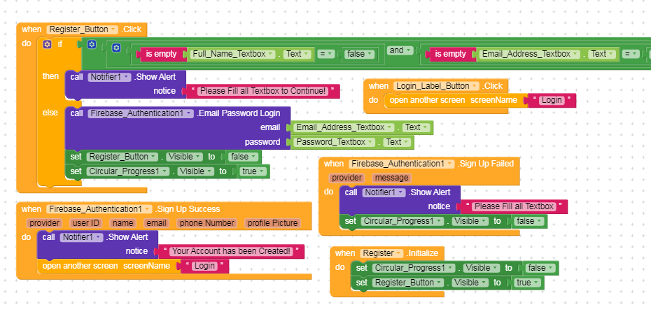 You are telling sign up but you have used login firebase authedicatin block in the register button?