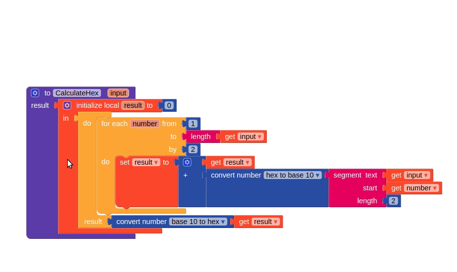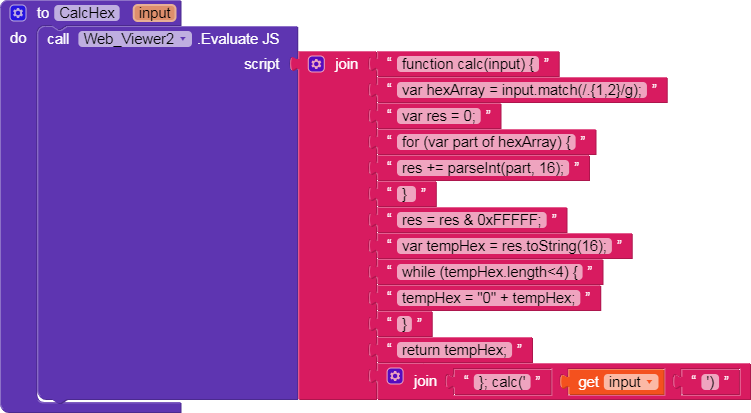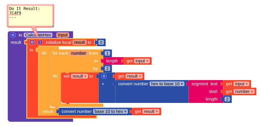 My current method using only blocks works fine but it’s SUPER slow and blocks the hell out of the main UI thread while the loops running adding up the values. When this same calculation is done in Android Studio it takes 5-10ms to add up each block, when its done in C# or C++ on micro controllers running as slow as 4mhz these blocks still only take 30-40ms to add up. Using blocks only it takes in the neighbor hood of 700-900ms depending on what the vales are that its adding up. Now the time to add up one block wouldn’t even be that bad but I need to sum as many as 512 blocks so this process becomes very time consuming when it could be done in a matter of a few seconds using conventional programming techniques for this.
