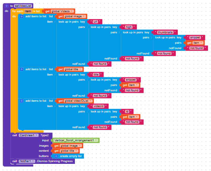 Make 3 List called Images, titles and subtitles and add items into it instead of adding it to the YoutubeList. After it finishes Call the Input Function of the Card View and set the images to the images list title to the titles list and subtitles to the subtitles list.